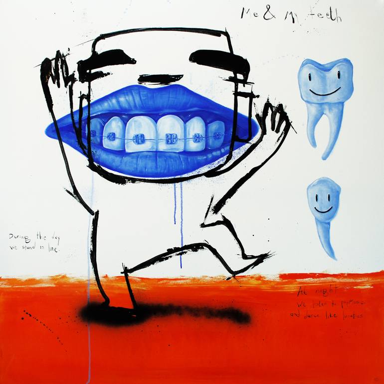 Text on the canvas: Me & my teeth. During the day we stand in line. At night we listen to popmusic and dance like lunatics.