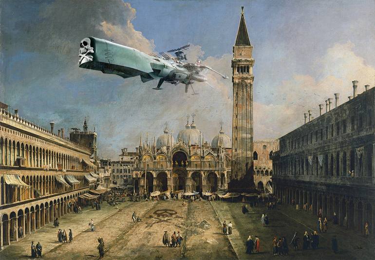 From "Intrusions" where elements of contemporary society appear and disturb paintings of a different time. Here, Captain Harlock's space ship Arcadia flies over the sky of Venice in the masterpiece of the Italian master Canaletto. ...among the people in the square a music star is hidden, look for h...