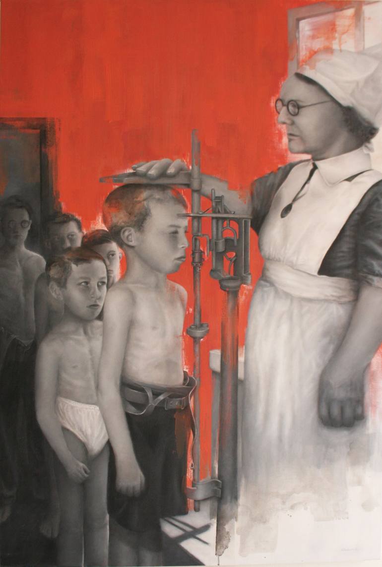 There is nothing more vulnerable than young children in a clinical setting. Set in an uncertain period of the former century, the children resignedly suffer their fate. The seemingly primary color choice fully accentuates this time period. The tension among the children versus the brutal nurse (with...