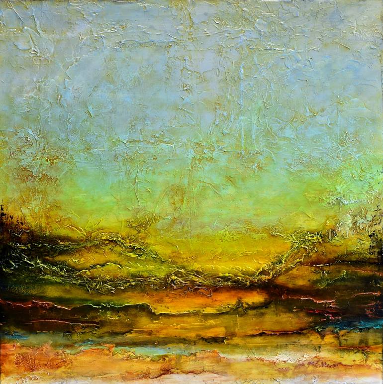 Rich colors and textures created by paper, pastes and gels make this abstract landscape (or seascape?) pop off the wall. DL Corn brings a richness to his use of light, color and texture.