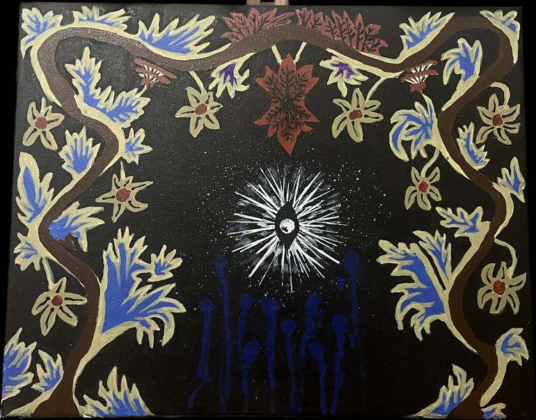 This painting draws inspiration from medieval aesthetics and symbolism. The central eye, with its inverted colors (a white pupil and black iris), is a visual metaphor for a unique perspective. The blue tears symbolize emotions and depth of feeling. The surrounding unreal, yet beautiful, medieval-sty...