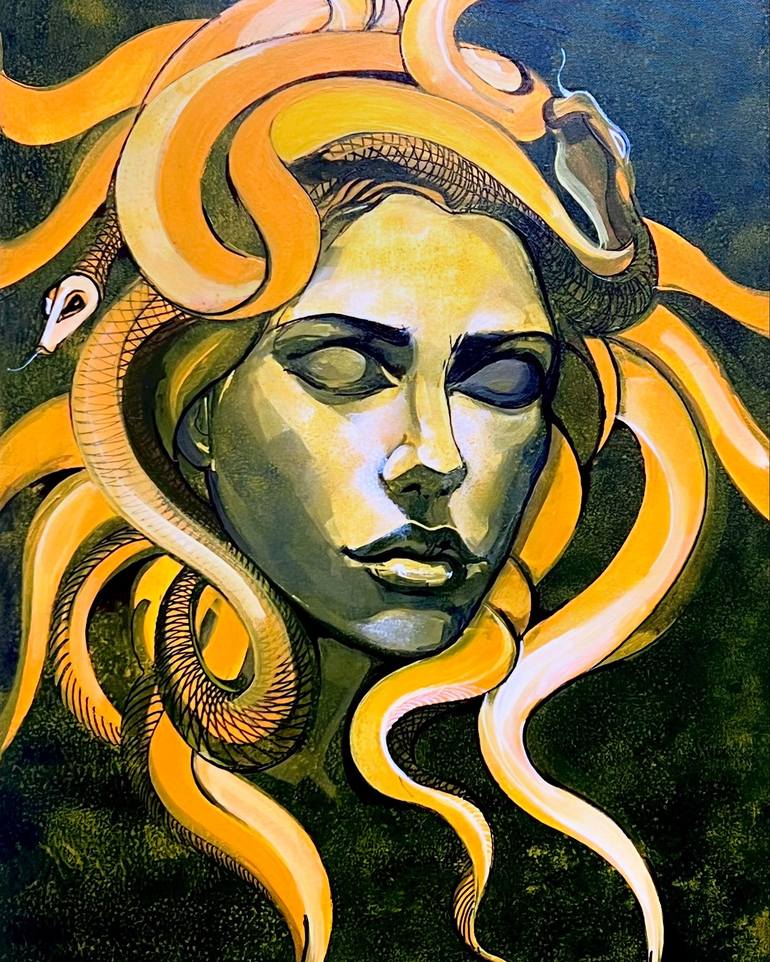 My inspiration: The Greek hero Perseus saves the bound Ethiopian princess Andromeda from a sea monster by turning her into stone using Medusa's head. The constant transformations and mathamorphoses correspond to my inner perception of the world, I associate the ambiguous shape of Medusa with myself.