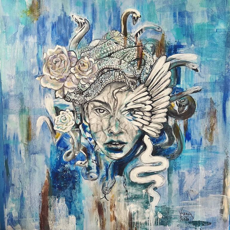 This is the portrait of Medusa, made with a variety of medias such graphite, acrylics and oils over a cotton canvas with marble dust. I have made her face as stone, in cold colors as I made this during winter, I have added roses to the snakes to create a balance between a heavy symbol as is the Me...