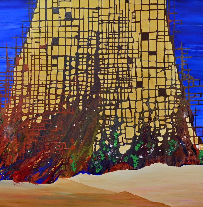 This abstract artwork, titled "Megapolis," features a yellow shape resembling a building set against a blue sky with a rust red grid. It measures 48 inches in height, 48 inches in width, and 1.5 inches in depth. Created on March 6, 2020.