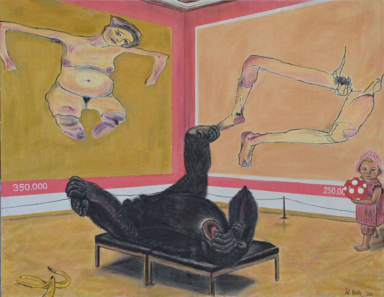 I was totally inspired and sort of fascinated when I read about this Viennese guy Egon Schiele and saw his strange presentations from the times of WW1. So I invented a gallery around two of his masterpieces and placed that funny laughing gorilla in the middle. Just in that moment a lovely little g...