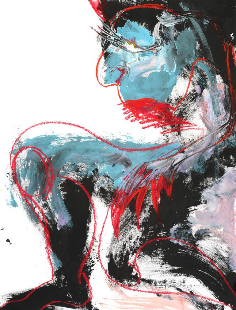This painting conveys the feeling of melancholy, inspired by a live model posing. Relates to the animal side of any human being. It takes its place in my monster collection. Expressive gesture energetic painting and minimalistic style. 2014 Colors used here: cerulean, peach, cantaloupe, spruce, s...