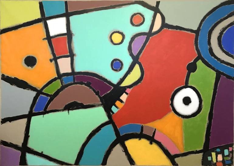 Colorful abstract geometric painting celebrating color. This is a large, bold statement piece, painted in acrylics on canvas.. This piece continues a series started in 2016. As an artist I often don't know where my brush and paint will lead me but I am always happily surprised! Titled, signed and da...