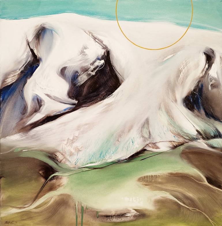 "Melting II" is an abstract oil painting on canvas inspired by the sublime beauty and impermanence of Icelandic glaciers. The composition is dominated by a sweeping interplay of white and icy blues, evoking the glacial ice in motion. Bold, dark accents suggest jagged rocky outcrops peeking through t...