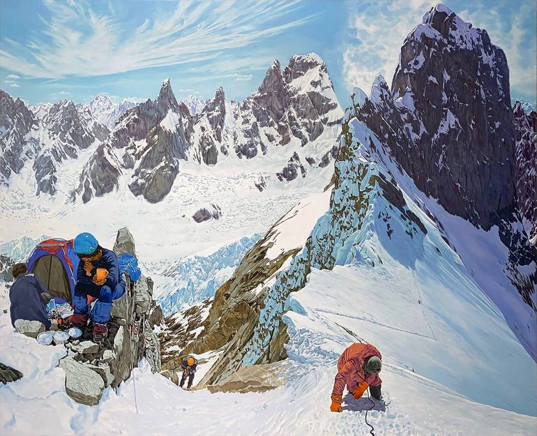 This painting depicts an airy spot for a mountain camp. The melting of snow for drinking water is going on. This being a very mundane yet important task for mountaineers. The fates of many climbers lives have depended on how much this simple task has been adhered too. Ridge lines are shear and encru...