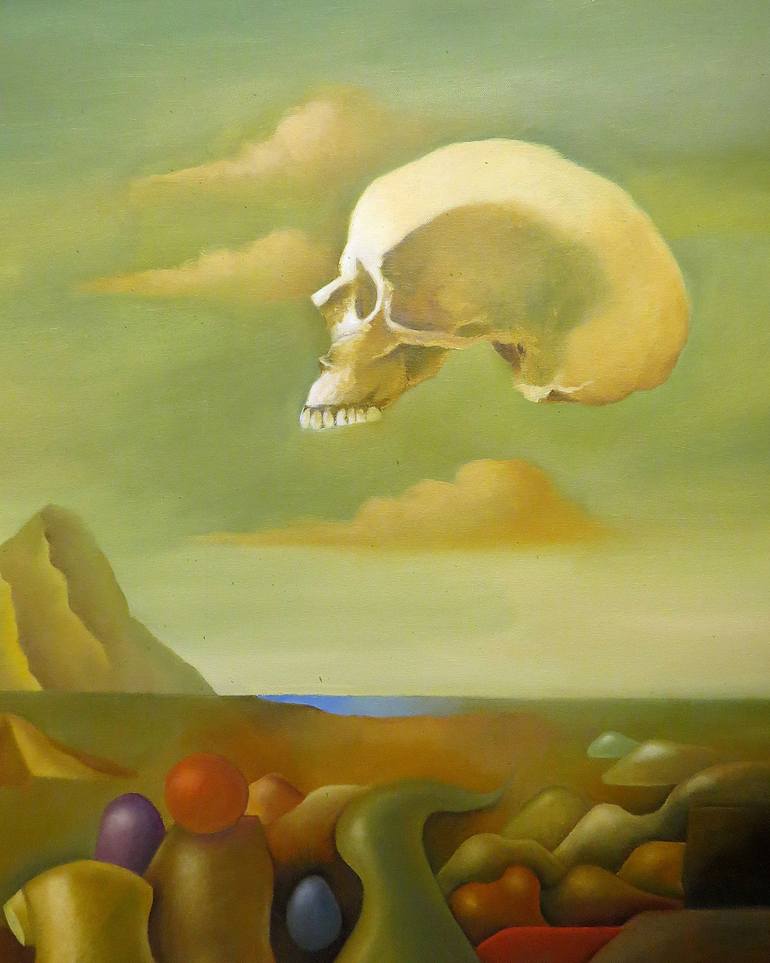 "When creating this artwork, I was deeply moved by the concept of mortality that hangs above us all, represented by the floating skull in a dreamlike green-yellow sky. The skull serves as a reminder of life's finite nature, floating like a specter above a landscape filled with abstract, organic shap...