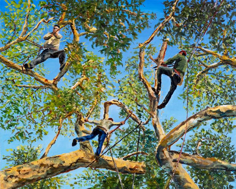 I am amazed at how fearless and skillfully tree trimming crews shape the giants in our neighborhood. After hundreds of photos as reference, I created this moment. It was great to get to know the guys who are so casually brave and who love the trees they work on.