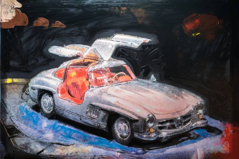 This is the SL300 , a dream car from the fifties.Main feature is the Gullwing doors which were designed for practical reasons.The tube metal frame of the car did not allow normal doors.This painting is based on the car that is exhibited at the Mercedes Museum in Germany .I used digital painting with...