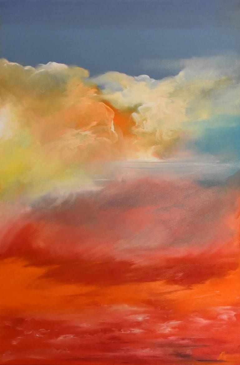 Merry Clouds is an oil painting on canvas. It suggest a state of well-being following a light rain. The clear blue sky is crossed by clouds in brillant and warm colors. This painting, part of a serie of ''Interior clouds'' was created in a state of happiness.