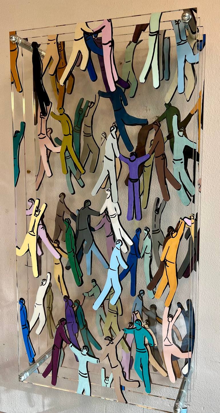 Silvia Strobos is a dutch artist who has been living and working in Switzerland since 1998. The main theme of her work is encounters. The importance of actual human interaction is key in our happiness and Silvia`s work highlight the joy of reaching out to each other, working together, dancing together and spending time together as friends and family. Her paintings are full and structured at the same time, as if she tries to organize human interaction. Her work pictures crowds but highlights the personal contact between a few. She often uses plexiglass in her work which layers the social structures, gives it more depth and thus emphasizes the personal encounters in the front. Her clear message is that in a world of algorithm, hashtags and followers, we shouldn't forget the importance of real physical human interaction. Since 2012, her work has been exhibited in several galleries in group exhibitions as well as in solo exhibitions, and shown at many international art fairs including Affordable Art Fair Hamburg, AAF Brussels, AAF Stockholm and AAF Amsterdam. In 2020 she had her premiere at the well known Art Karlsruhe. Other art fairs where her work was shown are the Art International Zürich, ArtMuc in Munich, Art Nocturne Knocke and the INC Hamburg. Strobos was also nominated for the dutch art Painting of the Year 2017, and was a semi finalist in the ArtBoxProjekt 2018 in New York, as well as winning the second prize in the Schoch Art Award 2019 in Switzerland. In 2022 she won the Voices of Tomorrow Art Award from the Contemporary Art Curator Magazine. Public purchases are made by Lakestar Advisors Zürich, Krämer Bau St. Gallen and the Immunology Center Zürich.