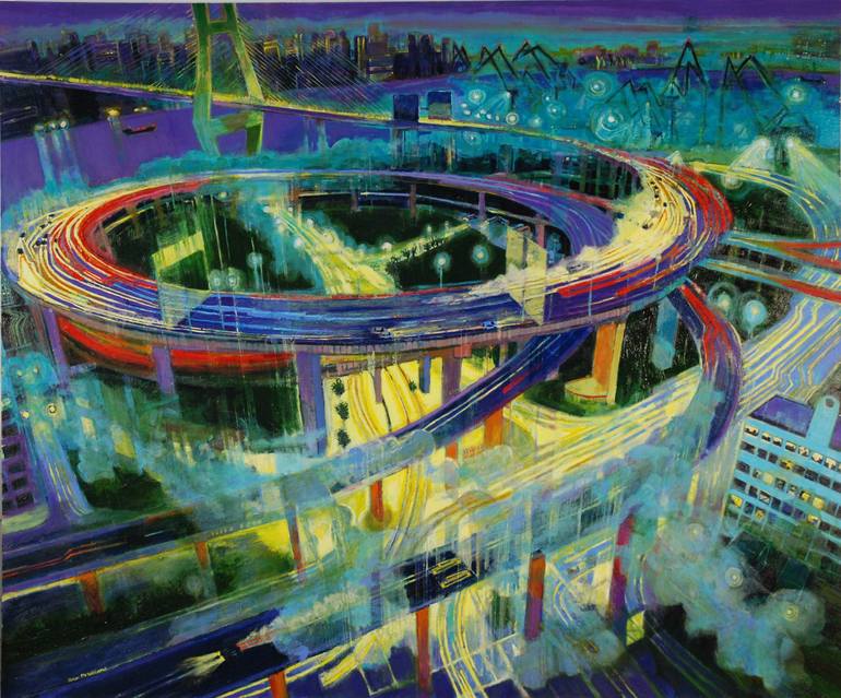 McWilliams' vibrant, structural urban landscapes are intertwined with organic elements of smoke, and vegetation. Observed phenomena and painterly playfulness combine to produce a unique vision that is part fact and part fantasy. Dust clouds created by ant-like workers on vast scaffolds, glitter in the sunlight taking on ghostly figurative appearances. Victorian curvilinear palm houses provide structural containers for the vegetation-like paintwork, which creeps like ivy across the canvas, propagating textures and marks with a life of their own in the medium. Shana Nys Dambrot in Art Ltd Magazine described his paintings as: "Evocative, wavering, dimensional, architectural, atmospheric, and chromatically paradoxical--more than depiction, these paintings rise to the level of embodiment. Self-consciously in progress, his work, like his subjects, present a metaphor for the way the modern world is changing, that change itself has become the defining quality of our time."