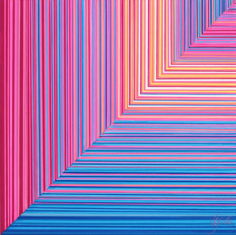 My hand painted work "Mi" is inspired by joyful melodies. This painting is one of a kind and somehow is connected with my wall sculptures -Roble and Carbon Series-. Lines that fall perpendicularly and create a three dimension feeling when work is observed from the side. The work is framed with a h...