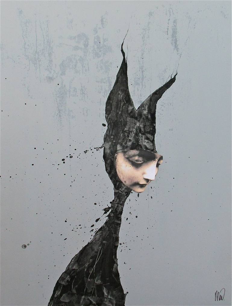 Mixed composition on canvas. A feline creature stands out sharply against a gray background. It forms a black silhouette. The body shows splashes, scratches and structure. A face has been added to the composition; a sculpted, angelic, serene and melancholy face.