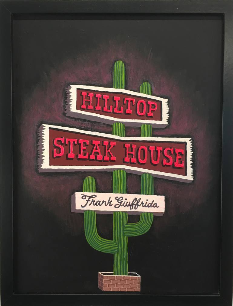 Painted in acrylic on wood panel framed in a back frame. I'm inspired by mid-century design, retro kitsch, vintage stuff and classic American road trip imagery. And of course neon!