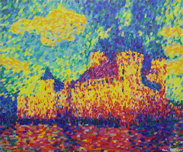 The process of creating the paintings can be found on social networks by my name Since the age of 8, I have admired the work of Paul Signac after seeing his painting "The Pine in Saint-Tropez". I studied the Impressionists and the Pointillists styles. My parents did not want me to take up paints and only my grandmother asked them to buy a plebiscite. After a while, after many hours of training I developed some recognizable styles, so that the painting was not only a beautiful addition to the interior but also an investment for the future