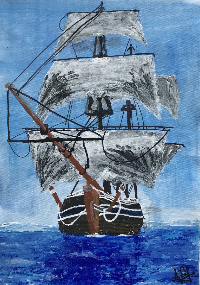 This original painting, "Middle of the Sea" by Aqsa Raja, captures a solitary old ship amidst the vast ocean, where the calming sounds of waves fill the air. This unique artwork is a testament to the artist's skill and vision. Crafted with high-quality acrylic paints and markers on canvas, the colo...