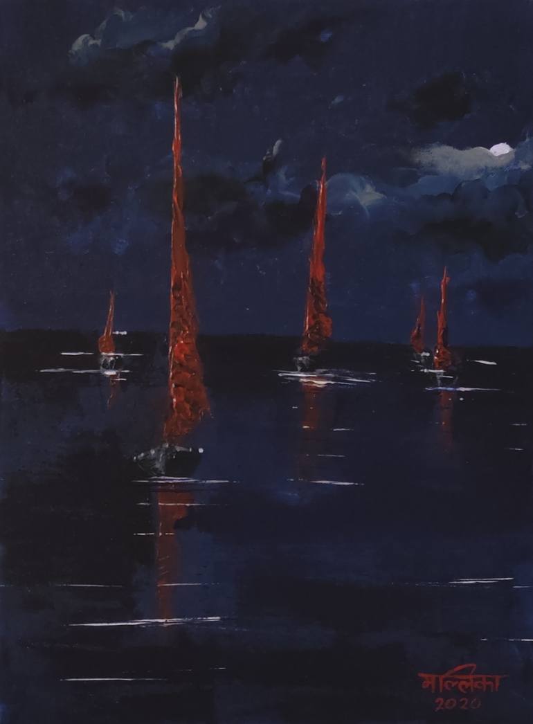 The semi-realistic painting reflects my love for water and nature. The sails of the boats sway gracefully with the gentle winds in the dark night. The water seems to become one with the sky as the horizon melts away quietly in the darkness. The gentle waves rocking the boats while the moon plays hi...
