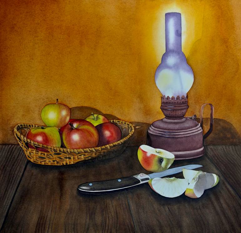 Juicy apples shine brightly in the lamp light. Rich colours make this a very attractive painting. This painting is framed without glass. The watercolour has a UV protective coating applied for longevity.