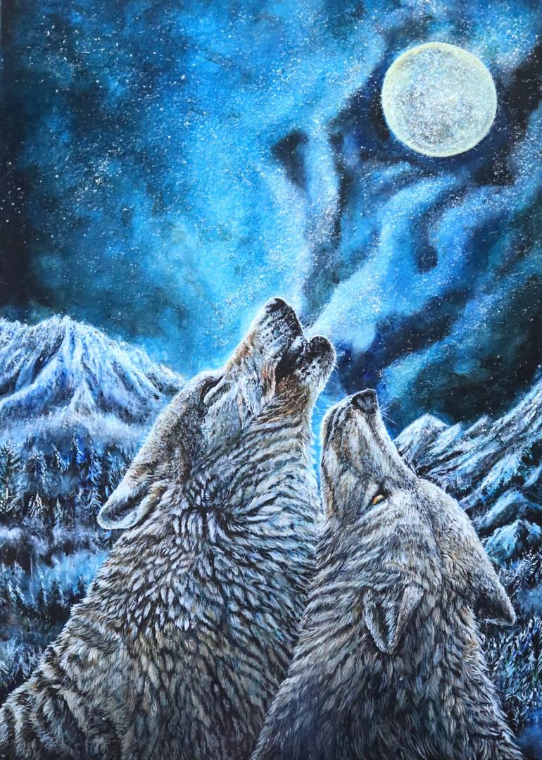 Original artwork composed of acrylic, diamond dust and a genuine natural diamond on stretched canvas. Moon glows under low lighting The piece contains a Genuine White Diamonds and will include a Certificate of Authenticity from Karin Brauns as well as from the Jeweler who supplied the gemstones.