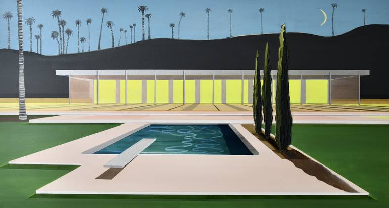 The artwork “Midnight Modern” portrays a mid-century modern bungalow reminiscent of Palm Springs’ characteristic design elements. Its long, sleek aluminum structure incorporates expansive sliding windows, offering picturesque views of the garden and the shimmering swimming pool. This serene depictio...