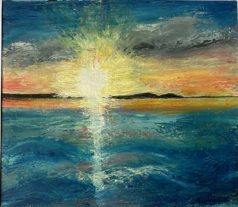 This is an oil painting done with a help of a photograph taken by my sister Vino in the Northern Norway when they were fishing in Sandland. When I saw the photograph felt warmth of the sunset in the midnight in Northern part of the sea. I would think viewers would and enjoy the beauty of the nature...