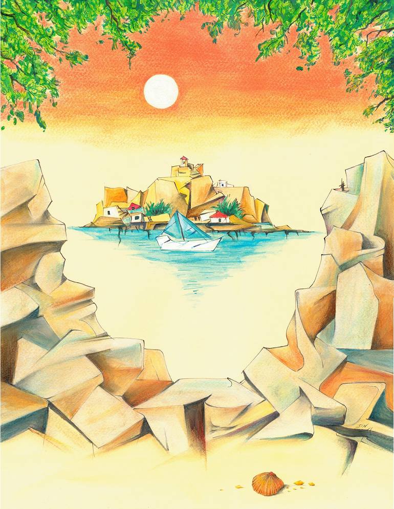 The magic of Aegеаn Sea - A mixed media painting. Rocks Near Palio - Kavala.