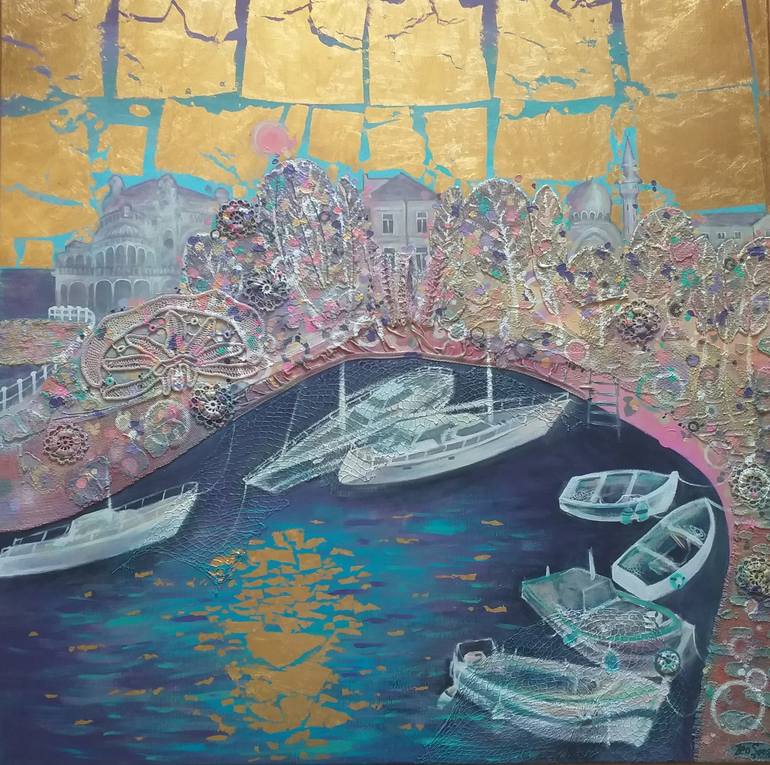 Size: 100/100 cm (39.37/39.37 inches) The artist idealized a touristic in her hometown, where she often goes to recharge her creativity. The picturesque view of the historical buildings gets perfected by the sea, and the poetry of the idyllic place is completed by a few boats. The artist also wants ...
