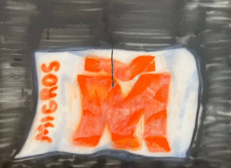 This artwork captures the essence of modern consumer culture by transforming an everyday Migros shopping bag into a striking piece of contemporary art. The large, fragmented orange “M”, instantly recognizable as the Swiss supermarket’s logo, dominates the composition, while the spray-painted “MIGROS...