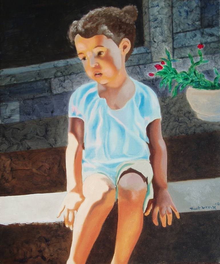 By the genetic of two skin color, the sky reflect in the shadow as the grief of a dear missing one, the daughter of the artist. Made from a picture took in the only one week when she visited me in Montreal. She was then two year and half old in the summer of 2003.