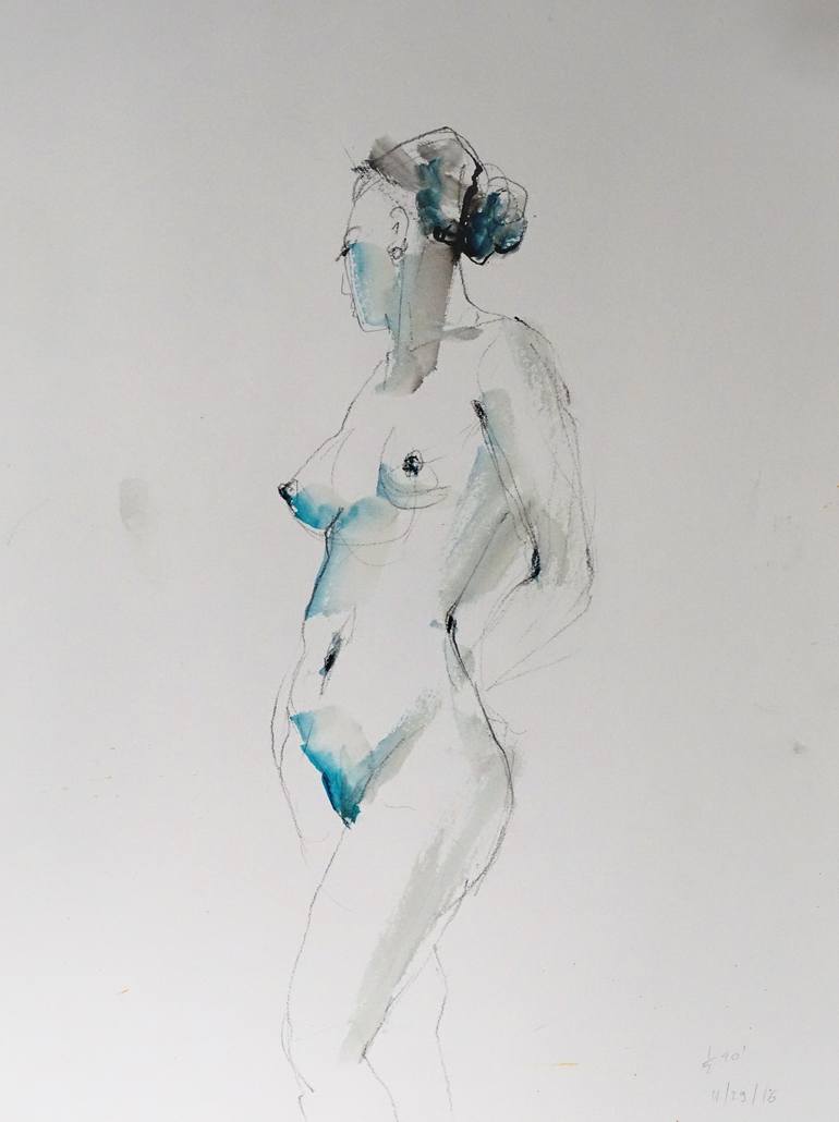 I drew this piece from life. The name of the model is Mina. I love her poses. I like to draw very freely, with loose lines and watercolor strokes. I started with charcoal and black ink which allow me to give very strong accents to my lines. In this drawing (and most of my drawings from life) I did ...