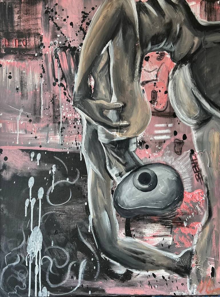The abstract pink background, with its splashes of white and black, creates a chaotic yet vibrant environment, symbolizing the complexity of human emotions and experiences. The bending naked woman's body, juxtaposed with a large eye as her head, signifies a profound introspection and self-awareness....