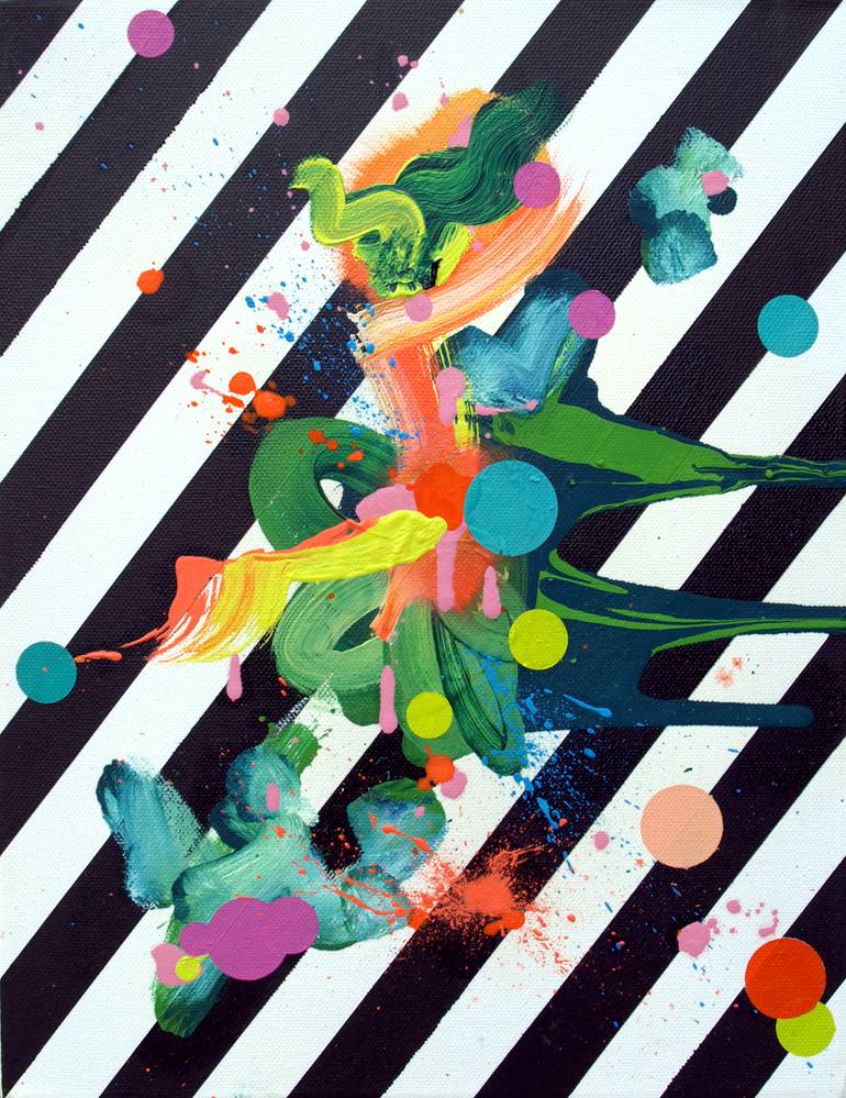 miniature minimal abstract painting featuring graphic hard-edged monochrome diagonal stripes overlaid with bright, vivid gestural paint