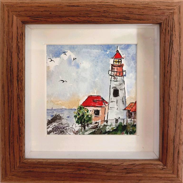 This watercolor painting captures the serene beauty of a coastal landscape featuring a tall, historic lighthouse standing proudly against the backdrop of the ocean. The red-roofed buildings nestled beside the lighthouse add warmth and contrast to the scene, while the birds soaring in the sky bring a...