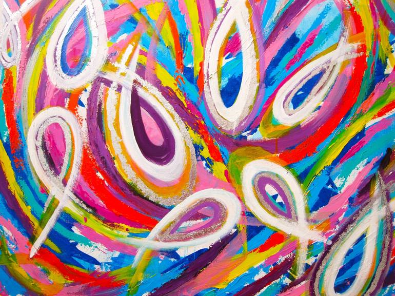 Original acrylic painting ' Miracle' features vibrant colors of Blue,yellow,pink.silver .