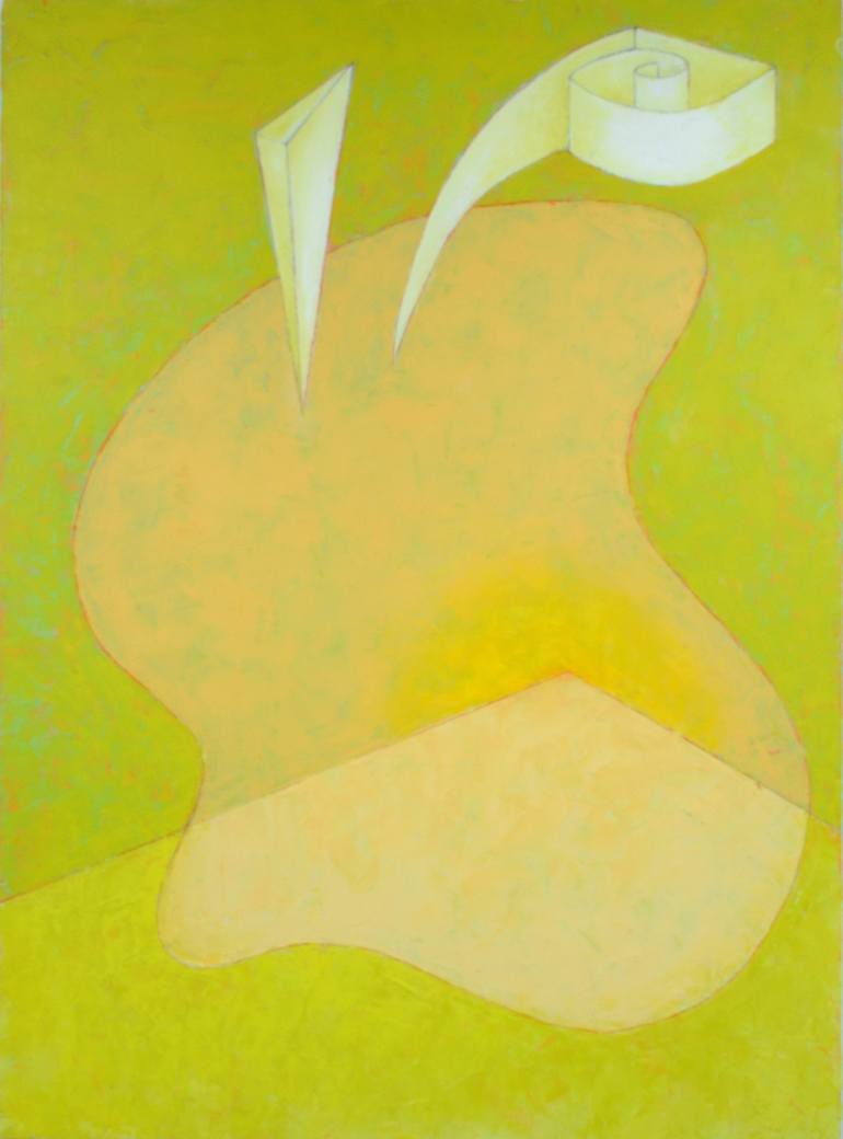 Abstract and symbolic forms interact in an implied architectural space while a mysterious light heightens the process which is occurring in this painting. Early modernism which influenced my work is combined with personal iconography for my take on painting and its power to address themes not easily...