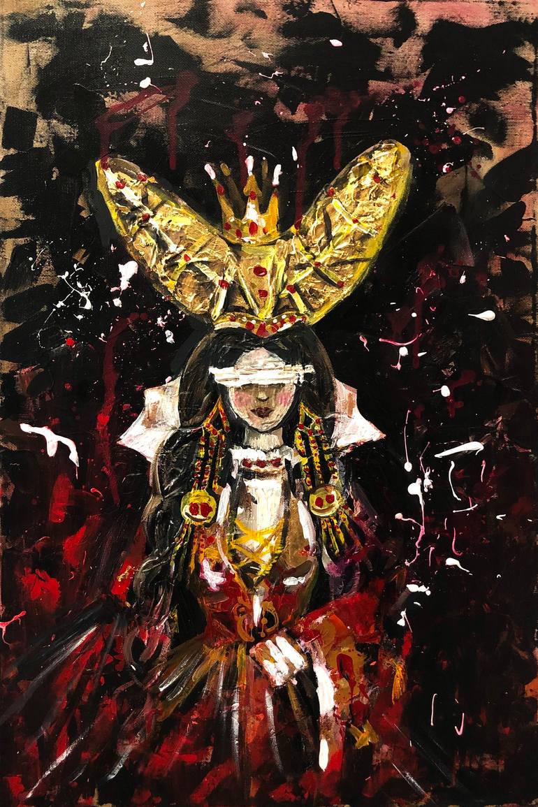 I was inspired by the image of the Mirror queen from the Brothers Grimm fairy tale. She struck me with her beauty and she was ready for anything to preserve her youth and beauty. From this tale we know that she abducted young girls for sacrifice. To reveal her image, I used black and red colors. In ...