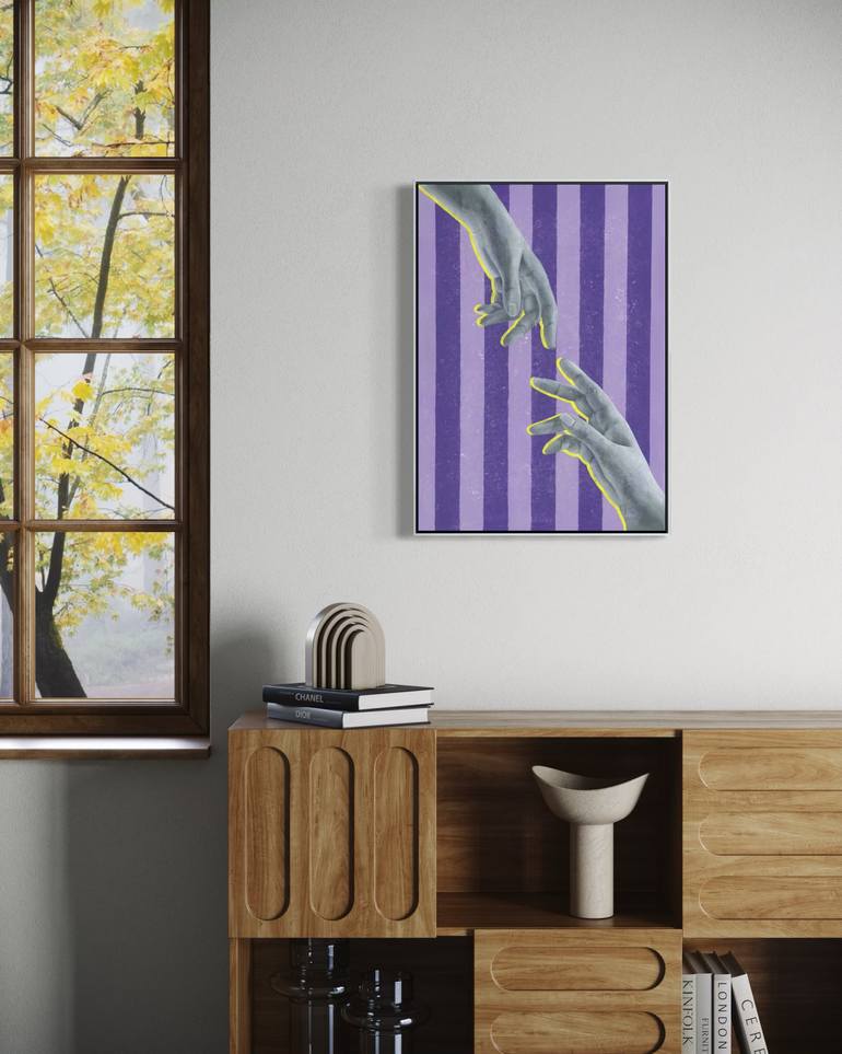 Two hands, suspended in a space of yearning, reach out toward each other, their index fingers almost brushing against each other in a gesture of longing. Painted in a palette of monochrome acrylics, the hands convey a sense of longing and unspoken affection. The stark contrast of the yellow line ag...