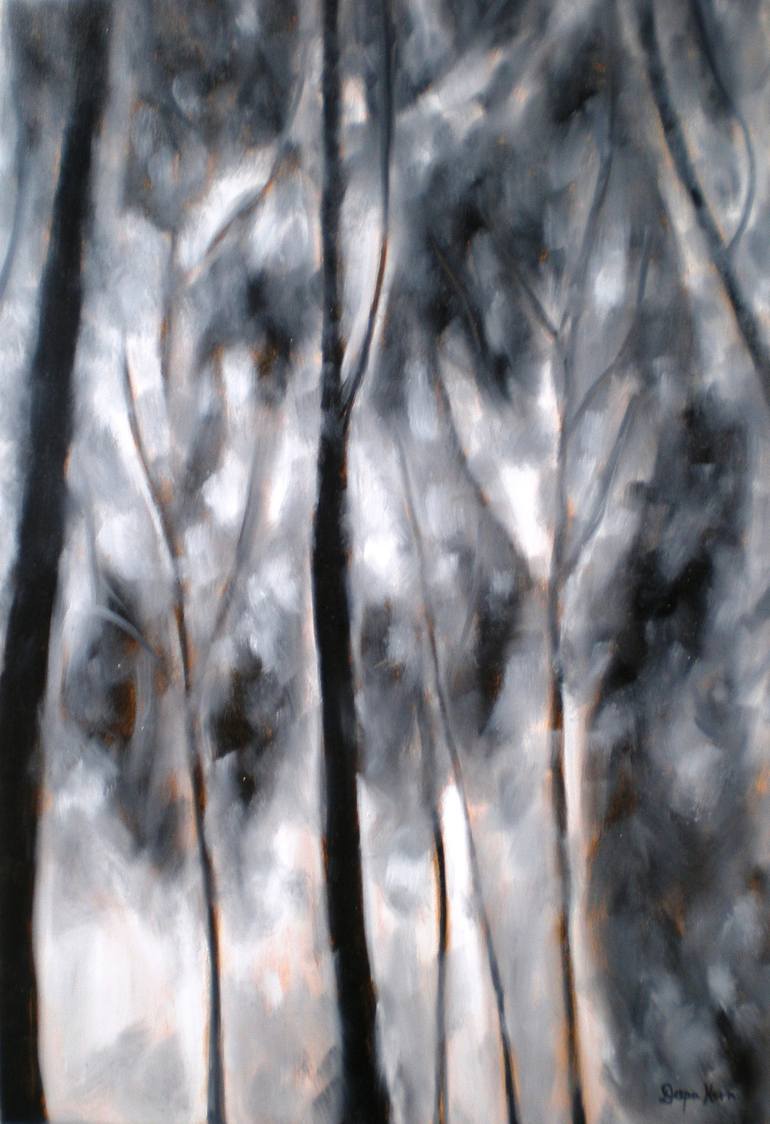 A painting in mainly black and white. A study in monochromatic colors of the forest with its swaying forms in the wind and dense foliage. Spontaneous brush strokes along with contrasting hues are used to create atmosphere. An original oil painting by Deepa Kern.