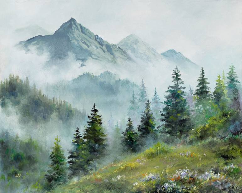 Transport yourself to a serene and enchanting forest of misty mountains with this stunning landscape painting. This work deftly captures the ethereal beauty of the mist as it gently embraces the towering trees and lush foliage. The soft, muted color palette adds to the dreamlike quality of the scene...