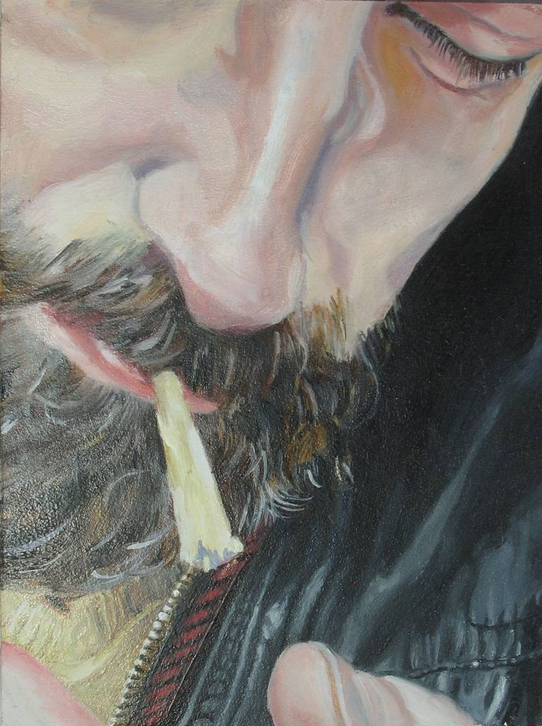 "Mitchell" Q: What makes you happy? A: Hanging around good people. Mitchell is one of 21 portraits I painted of people in a series called, "Up Close and Personal". I Wanted to depict my subjects in a tightly cropped image, up close, breaking the an individual's personal space.