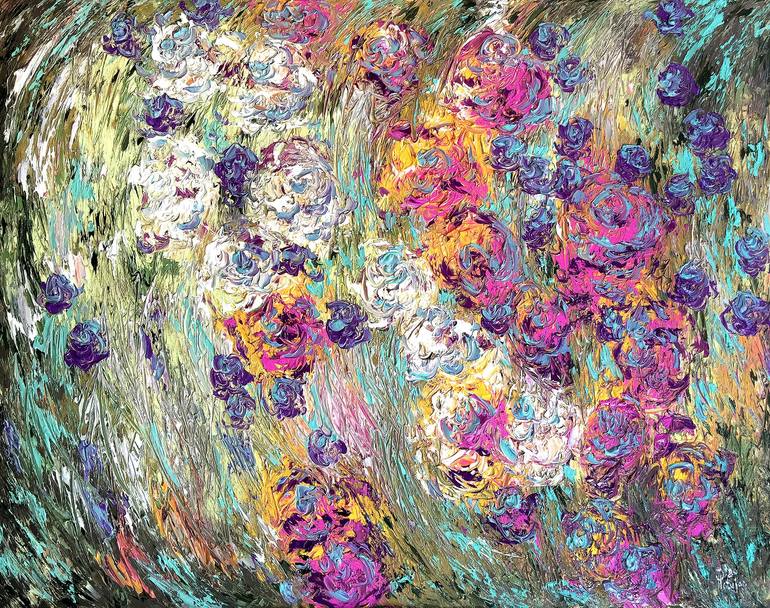 Original contemporary oil painting on canvas with a heavy texture impasto brush stroke. Signed on front. Painted edges. Artwork on supported wooden frame - stretched canvas. Wired and ready to hang, no frame needed.