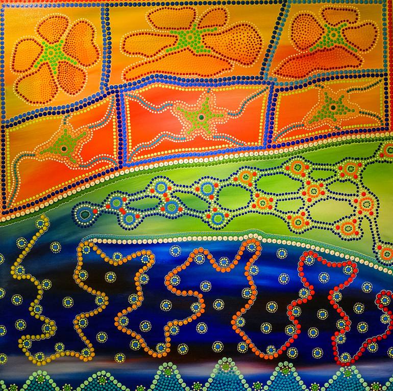 Hand painted acrylic on canvas , each dot painted separately. This is not a digital image. You can hang this painting vertically or horizontally. The artist's signature is on the back of the painting.