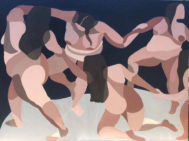 Elisa Valenti is a self-taught contemporary figurative painter whose works delight in the beauty and vigor of real, luscious bodies. Valenti’s paintings are a sensuous celebration of form. Voluptuous figures reach, twist and revel in a Fauvist dance across the canvas, honoring their vessels. The bodies Valenti paints serve as a looking glass for those whose own bodies have been underrepresented in modern and contemporary art. Growing up in a culture where body-positivity did not yet exist and worthiness could only be equated with thinness, it wasn’t until Valenti started painting bodies that looked like hers that her journey of self love began. Utilizing arresting colors evocative of the Fauves and Cubist color-blocking, Valenti adapts two iconic styles pioneered by men and flips the gaze inward. As well, she draws inspiration from her mother’s career as a lingerie sample-maker and master dress maker, venerating the celestial mounds and valleys of the female form. Each brushstroke highlighting the curve of a hip or roll of flesh is an act of defiance – a celebration of radical worthiness.