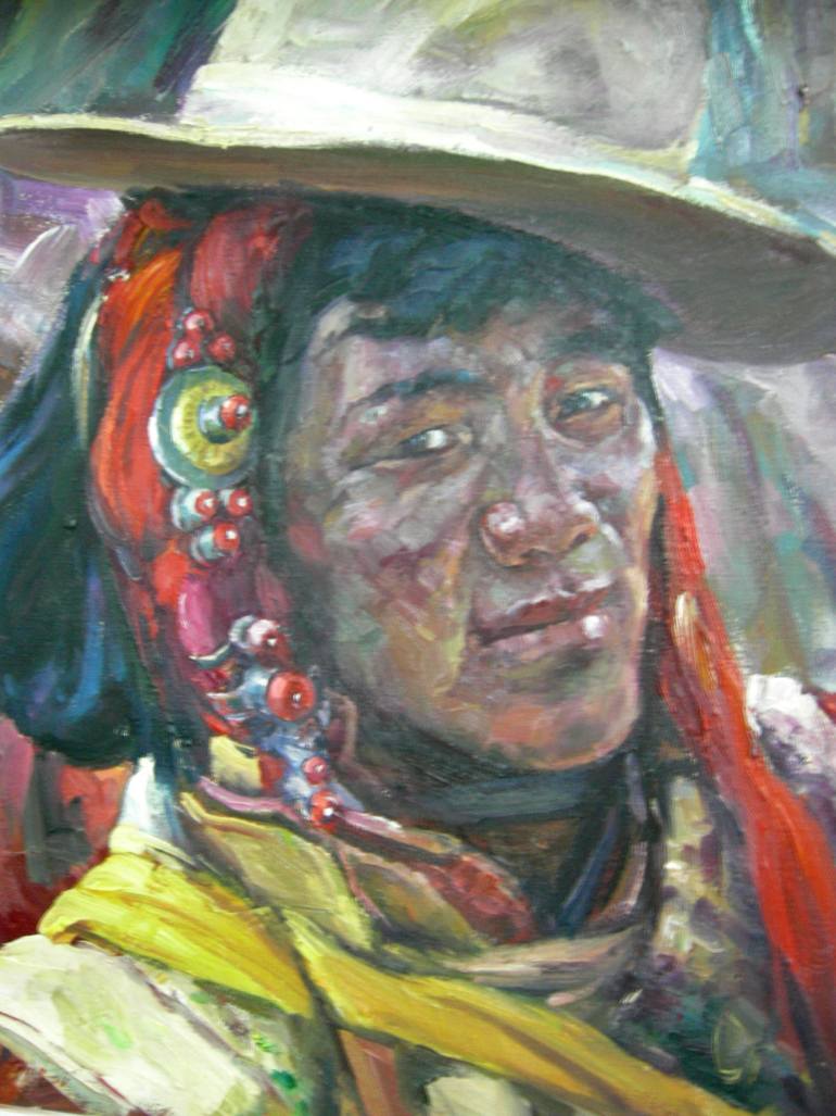 Modern Tibetan Man: oil painting portrait by Dapu (Ai Min Zhang) He wears his hair long but neat. He has traditional beaded and braided headband on underneath a more fanciful modern cowboy hat. He is a modern man from the Tibetan Plateau, in the region around the border between China and Tibet. ...
