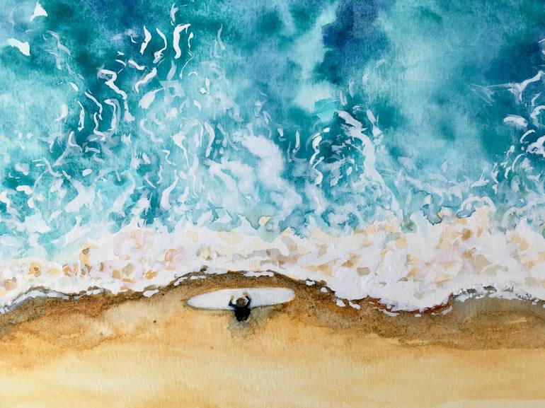 ‘Moment of Calm’ captures that moment where you prepare to paddle out into the surf. It is the time you watch the waves, work out where you are going to go, stretch, let go of your land dwelling and become part of the sea. Original watercolour on paper comes mounted in a snow white mount with back...