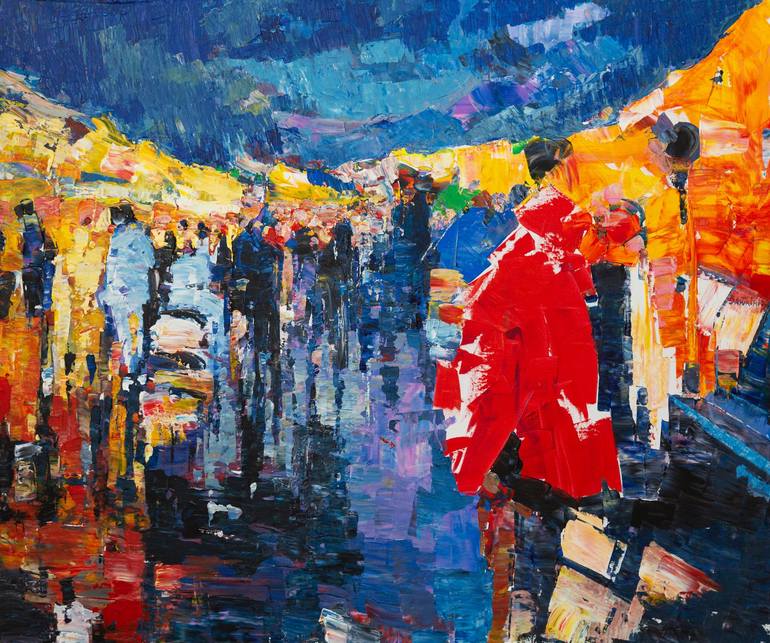 A noisy evening street where the hustle and bustle of everyday life is fully manifested. People around are immersed in their own thoughts and activities, each in a personal moment of life. I decided to paint the scene during the golden hour, when the sun is setting and the light is warm and soft. I ...